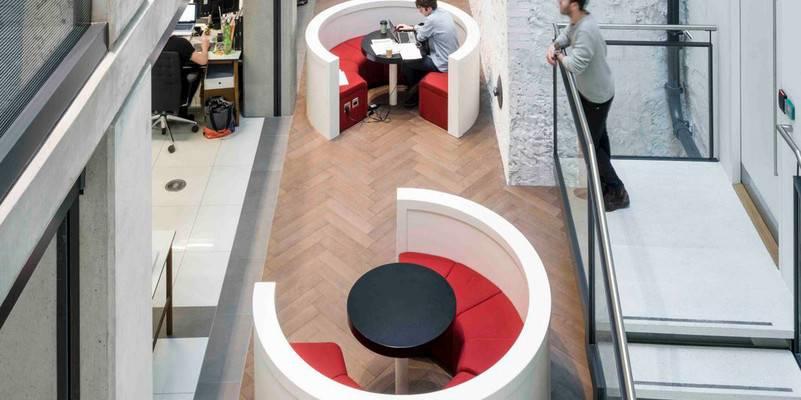 靈活的座椅位于每一層,定制粉紅皮箱設(shè)計,包在預(yù)制混凝土和胡桃木桌子旁邊的數(shù)據(jù)和電源連接點,為員工提供了“突破”的空間,但仍在辦公室內(nèi)協(xié)同工作。