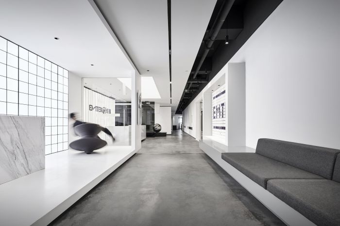 這是一個檢測科技公司辦公室的設(shè)計,有1000方的面積。設(shè)計師在重新設(shè)計品牌空間時,通過延續(xù)黑白灰的基調(diào),加入對立、沖突的元素,消解空間軸線的刻意規(guī)律感。