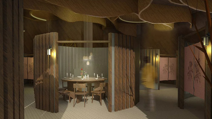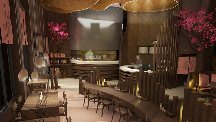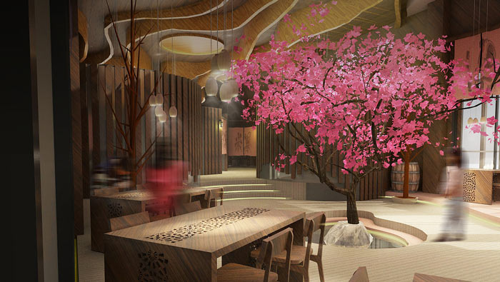 特色風(fēng)味餐廳氛圍設(shè)計(jì):在餐廳的中央有一顆桃花盛開(kāi)的桃樹(shù),客戶(hù)不管在哪里就餐,都可以看到這美好的一面,這也是設(shè)計(jì)師給客戶(hù)的福利,讓桃花朵朵香成為一種享受。