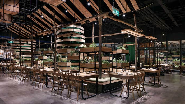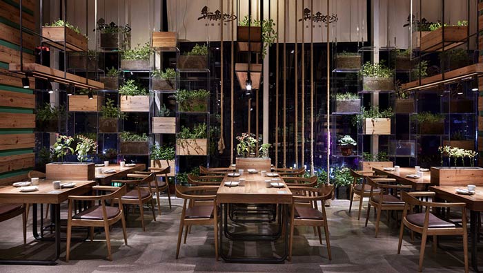特色生態(tài)餐廳餐區(qū)設(shè)計:蔬菜陳列架在空間隨處可見,設(shè)計師把陳列架量化,成為空間的最小單元,這樣易于隨著季節(jié)的更換及搬運(yùn),空間四周滿滿的種植區(qū),賦予空間生命力。