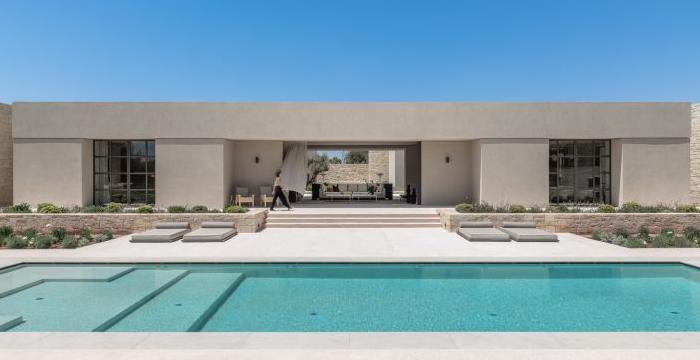 一間現(xiàn)代簡約別墅裝修設(shè)計(jì)案例,空間面積600平方米。它有4間臥室和4間浴室,一間餐廳,一間電視房,一間接待室,一間廚房,一間辦公室。